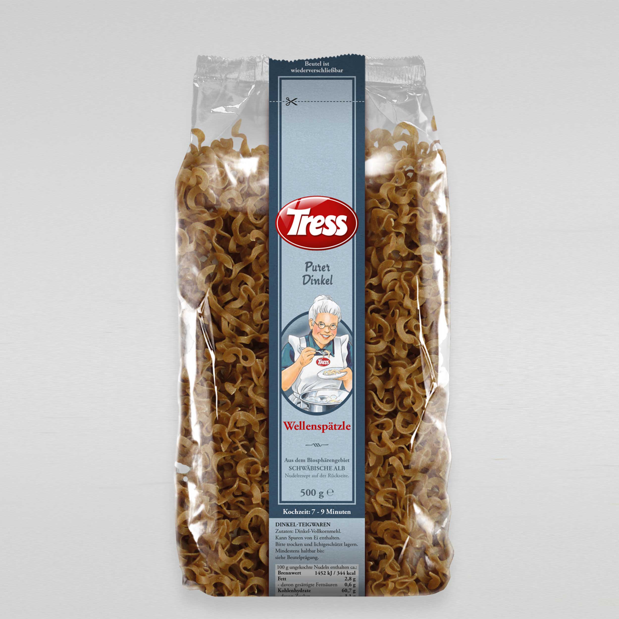 Der Dinkel für die Bandnudeln stammt aus dem Biosphärengebiet Schwäbische Alb. Hier wächst das Korn, hier wird es gemahlen – eine transparentere Lieferkette ist kaum möglich. Dieses Vollkornmehl wird nach original Tress-Hausrezept äußerst schonend verarbeitet, sodass die wertvollen Inhaltsstoffe des ganzen Korns und die fein-nussige Geschmacksnote erhalten bleiben.