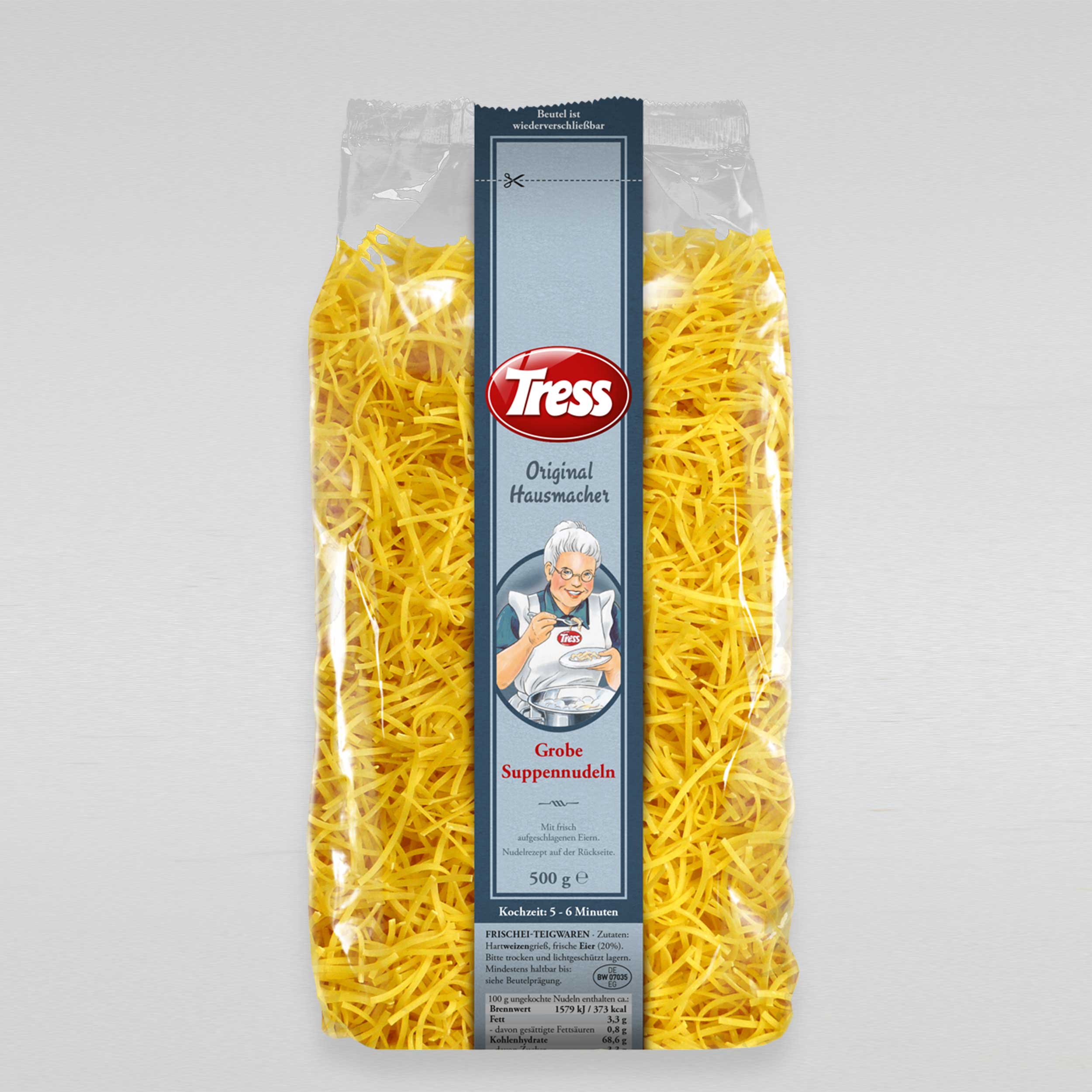 Die Originals Hausmacher-Nudeln von Tress werden in traditioneller Handwerkskunst auf der Schwäbischen Alb hergestellt – aus hochwertigem Hartweizengrieß und 20 % Frischei aus artgerechter Haltung. Alle Eier stammen aus zertifizierter KAT-Tierhaltung, werden täglich frisch im Werk aufgeschlagen und direkt weiterverarbeitet. Die große Vielfalt unserer Original Hausmacher Eiernudeln ermöglicht das Pressverfahren: Der Teig wird durch spezielle Matrizen gedrückt, wodurch die Nudeln ihre individuelle Form und die glänzende, goldgelbe Farbe erhalten. Die Spätzle – traditionell ins kochende Wasserbad getropft oder geschabt – runden das Sortiment ab und garantieren Genuss für alle.