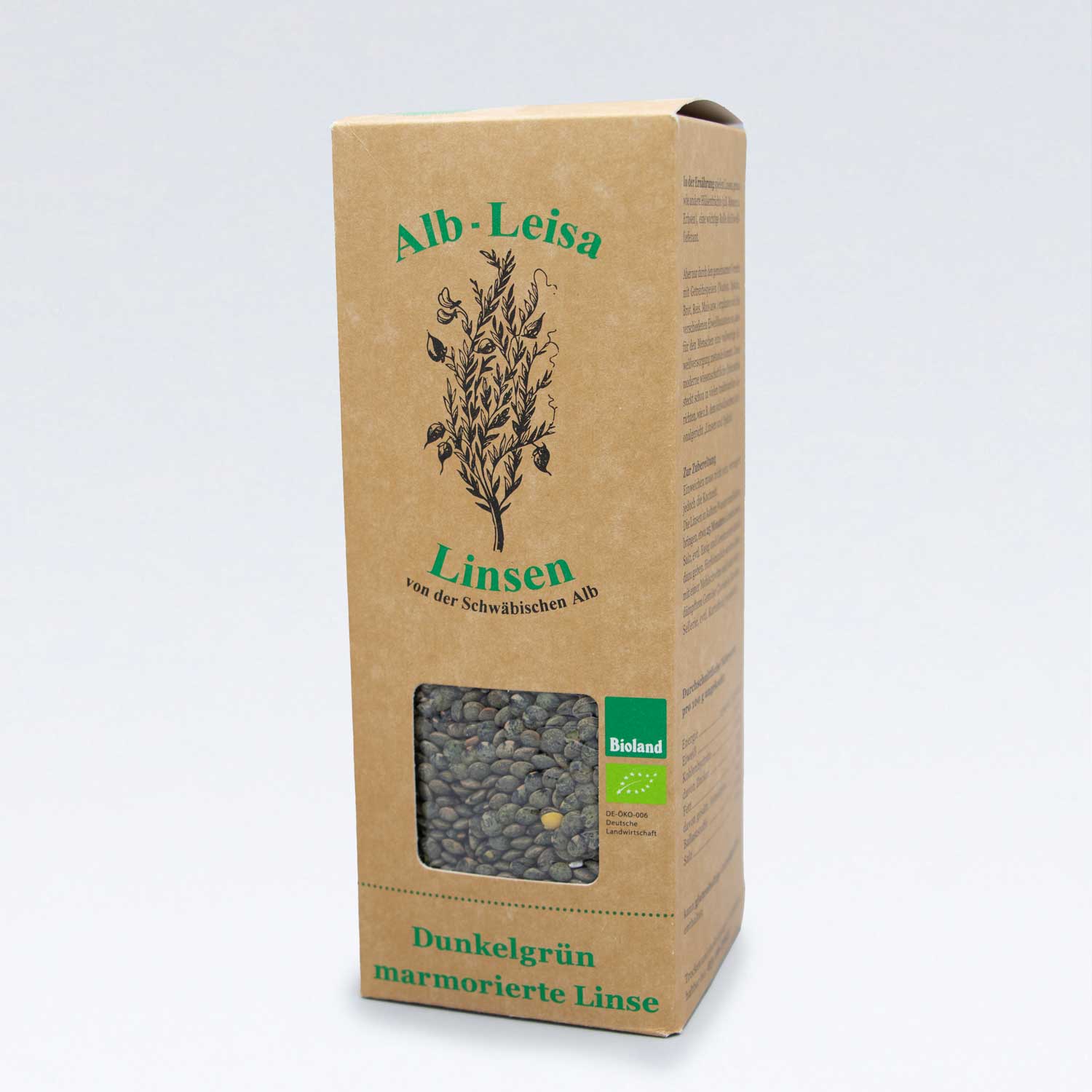 Die dunkelgrün marmorierte Alb-Leisa ist eine mittelgroße Bio-Linse mit marmorierter Schale von hellgrün bis schwarz. Sie stammt aus ökologischem Anbau auf der Schwäbischen Alb und ist Bioland-zertifiziert.